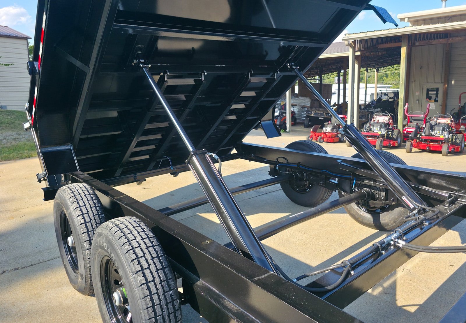 Spacious 12′ Hydraulic Dump Bed & 8′ Utility Platform: The trailer includes an impressive 12-foot hydraulic dump bed with 3-foot sidewalls for efficient material handling, alongside an 8-foot utility platform.